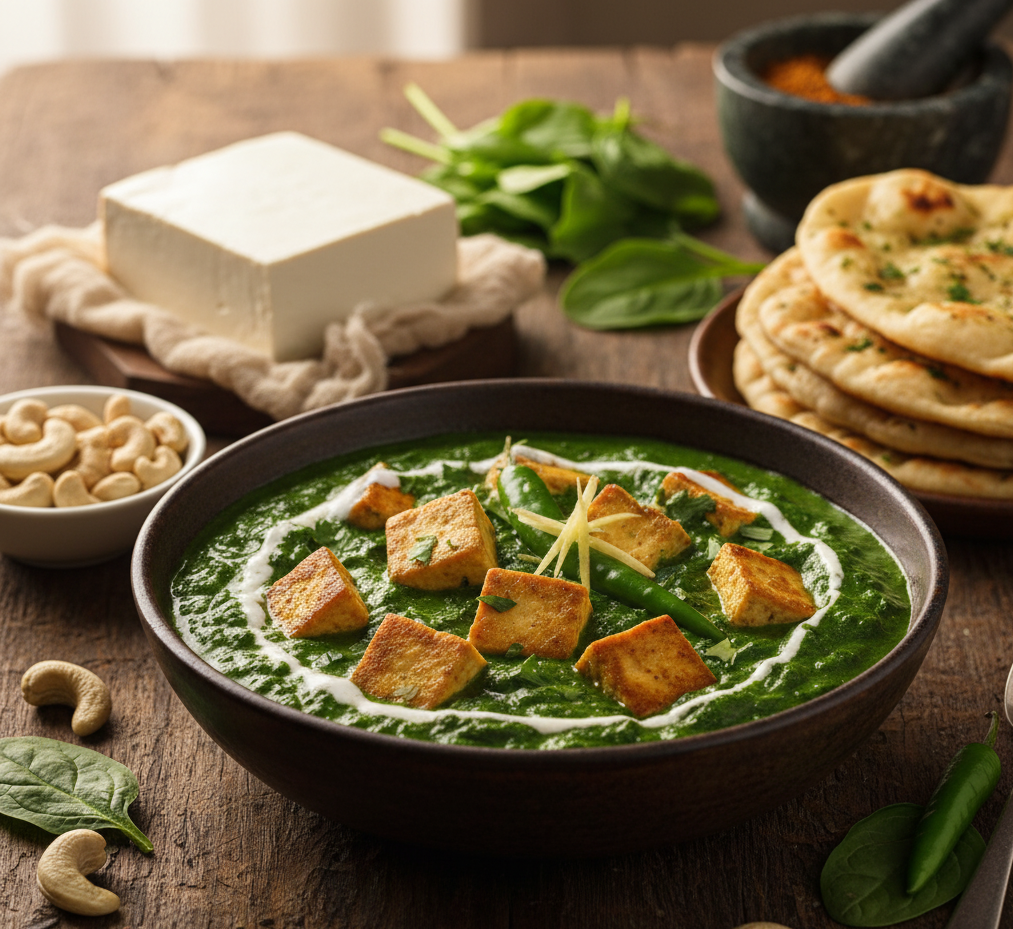 - Make the Spinach Paste: Drain the soaked cashews. Squeeze the excess water out of the blanched spinach. In a blender, combine the spinach, soaked cashews, and green chilies. Blend until you have a smooth, creamy paste.